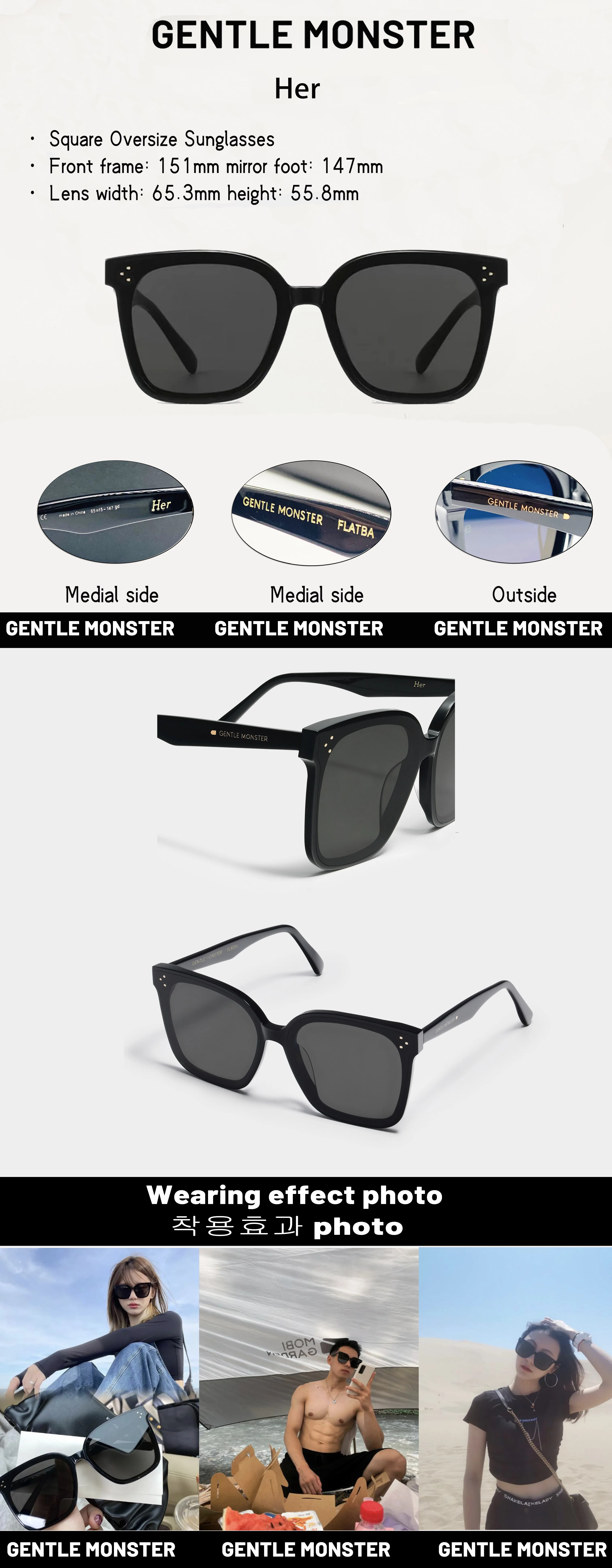 Her is the boxy Oversize Flatbar sunglasses from the sunglasses line. Cat's eye shape frame, mirror end inlaid with bullet decoration nails, mirror leg engraved Gentle Monster logo. Lenses provide high efficiency UV protection.
