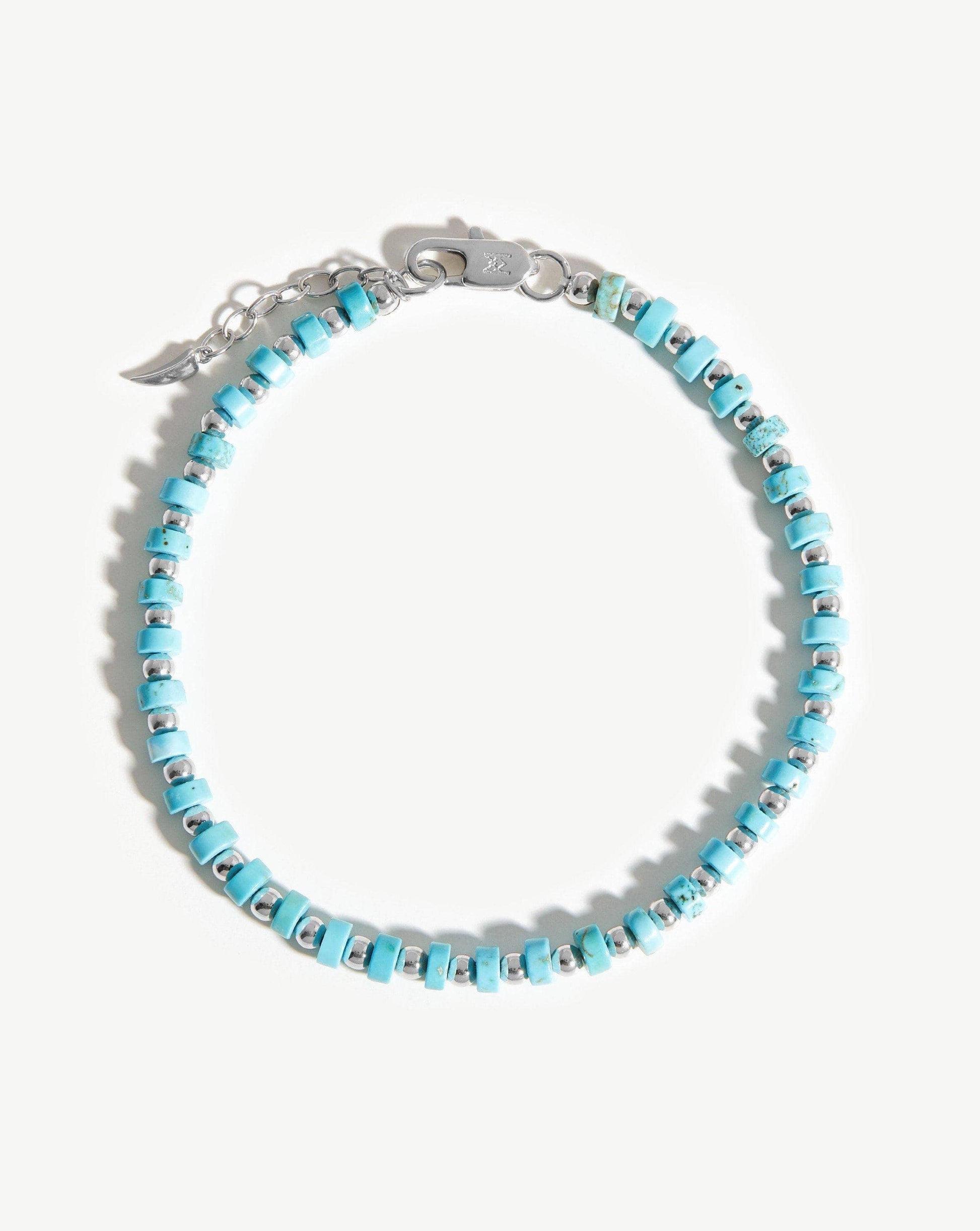 A kaleidoscope of colour to express yourself with. Bringing calmness, turquoise and blue crystals stones form this bracelet and are contrasted and offset with small silver beads for a distinctive finish. Wear solo, layer with more beaded styles or stack with one of our signature chunky chains.