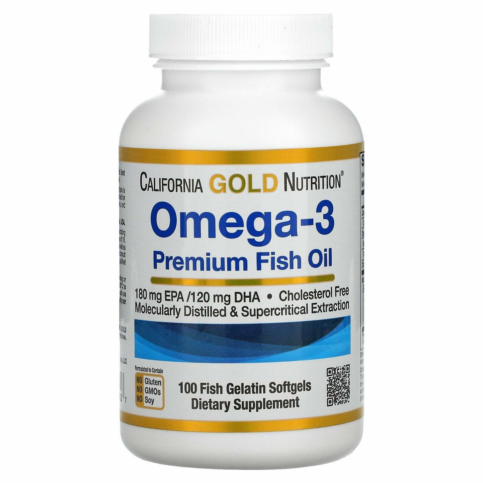 California Gold Nutrition®️ Omega-3 Premium Fish Oil is a molecularly distilled, supercritical extraction that features 180 mg EPA and 120 mg DHA, per capsule, of globally sourced highly refined and concentrated natural fish oil that meets strict quality control standards. The fish gelatin softgels are porcine and bovine free and manufactured in California, USA with internationally sourced ingredients.