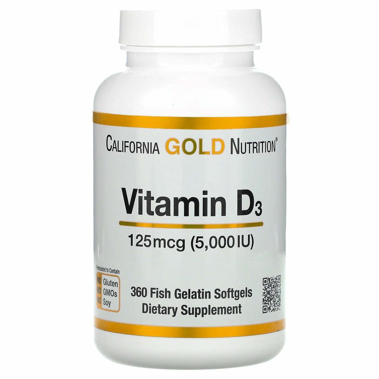 California Gold Nutrition Vitamin D3, 125 mcg (5,000 IU) features Vitamin D3 as Cholecalciferol from Lanolin in Fish Gelatin Softgels.