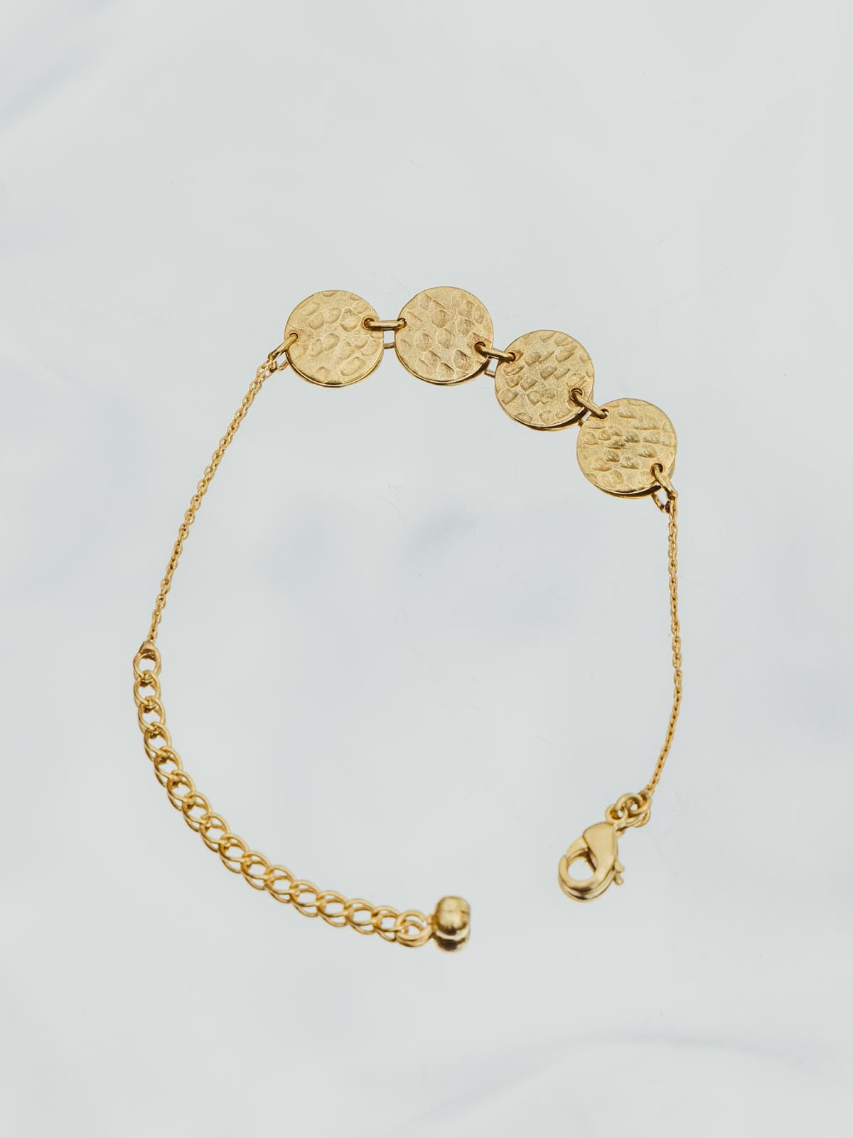 Four small hammered discs on a delicate chain make this bracelet a standout piece that effortlessly complements both casual and formal attire. Add some flash to your ensemble with this handcrafted accent piece. The artisans at Dekko Trading Co mix modern design with the age-old craft of metal working to create this gorgeous strand of hammered discs.