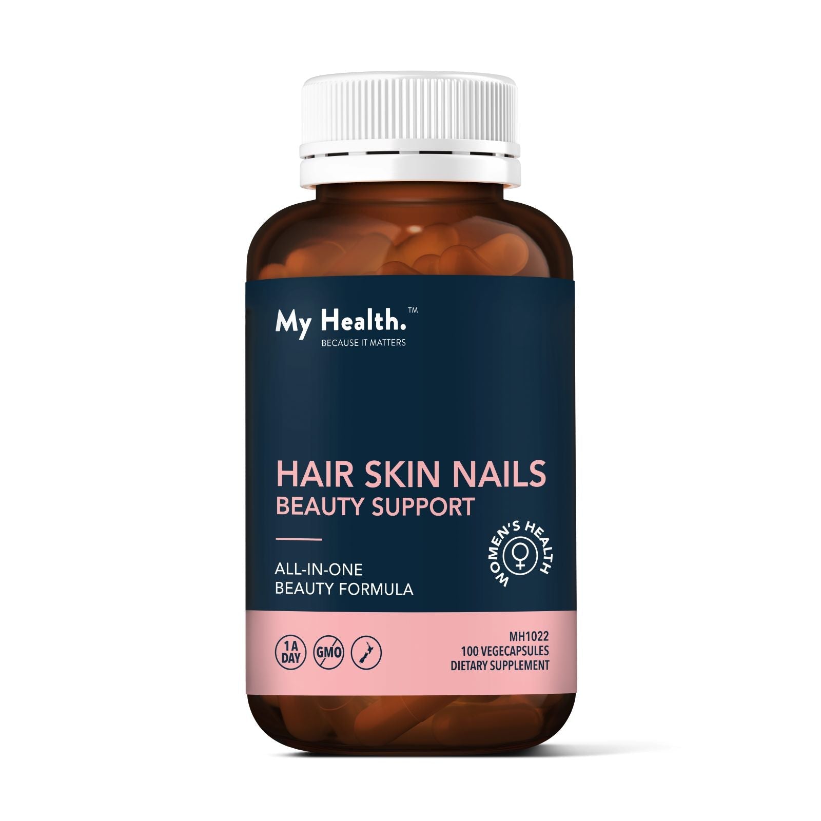 Is an all-in-one beauty formula to help support healthy hair, skin and nails. Containing high strength Grape Seed, a powerful antioxidant that supports collagen formation and helps fight free radical damage. Combined with hydrolysed Collagen for a healthy complexion. My Health Hair Skin Nails Beauty Support provides a daily dose of beauty nutrients to support you from the inside, the perfect addition to your daily beauty routine in the convenience of a one-a-day dose.