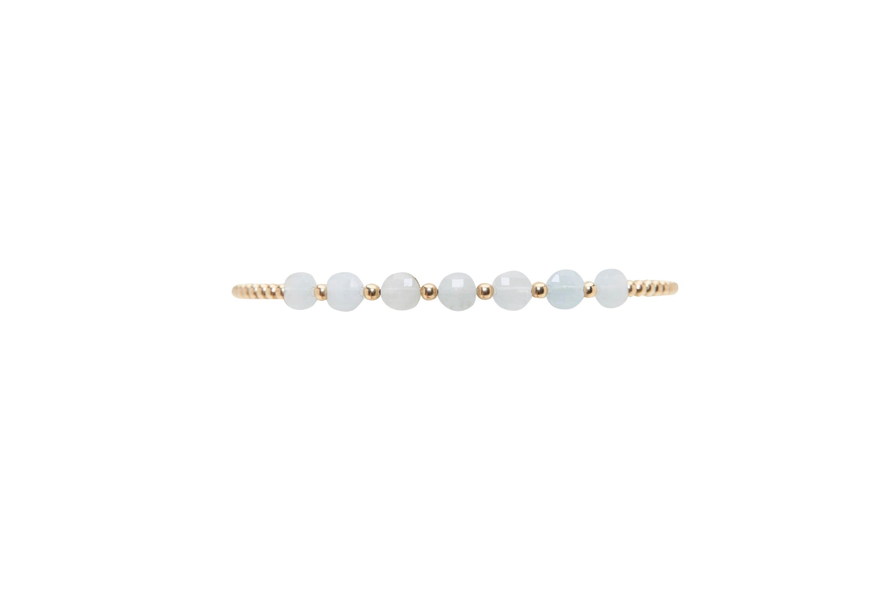 Our 14K Yellow Gold Filled Bracelets are strung on elastic cord adding a slight stretch for easily rolling on and off your wrist. Available in various gemstone choices and patterns, such as Aquamarine, Watermelon Sapphire Ombre, Moss Aqua, and more.