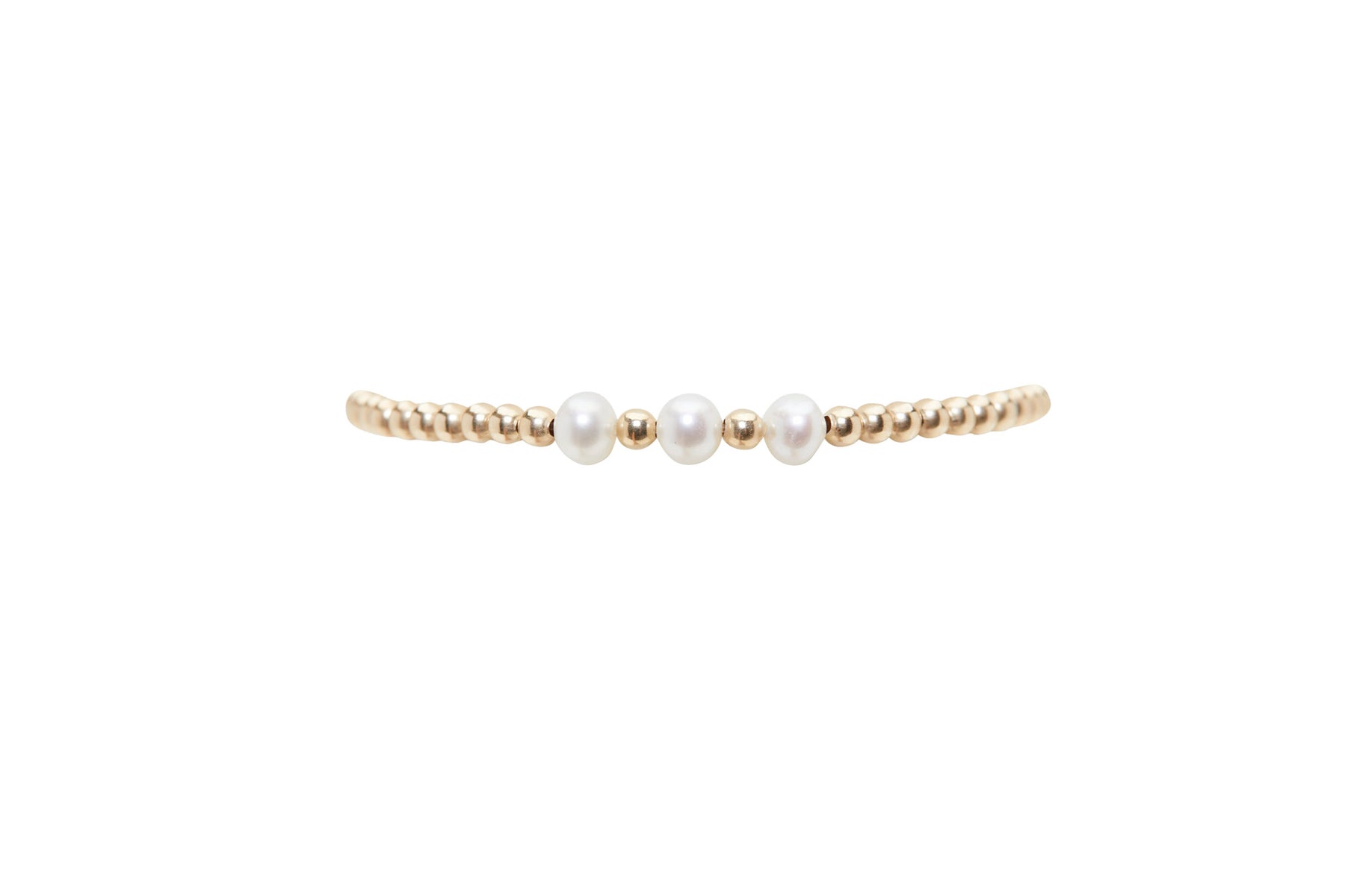 Our 14K Yellow Gold Filled Bracelets are strung on elastic cord adding a slight stretch for easily rolling on and off your wrist. Features 3 White Pearls as an accent.